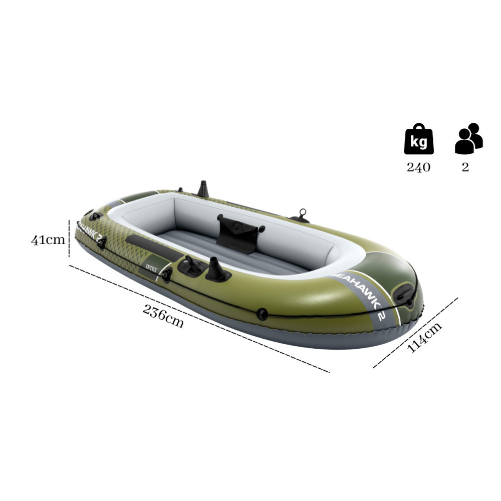 Ponton Seahawk 2 to solidny ponton wędkarski 2-osobowy. Model INTEX 66332 to komfortowe warunki dla dwóch dorosłych osób o maksymalnej dopuszczalnej łącznej wadze 240 kg. Ponton posiada certyfikaty jakości i bezpieczeństwa.